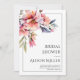 Este convite de chá de noiva apresenta um ramo de rododendro no canto superior esquerdo com flores rosa pêssego e uma fina borda preta. O texto no convite é apresentado em tipografia decorativa. A fina borda preta do convite complementa perfeitamente o tema floral, criando um visual coeso e atraente para o evento.