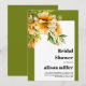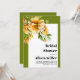This fall bridal shower invitation showcases a rhododenron branch on the upper left corner of a white frame adorned with delicate orange yellow flowers and bordered by an olive green color. The text on the invitation is presented in a bold typography, making it stand out and easy to read. The olive green borders that frame the invitation on three sides complement the floral theme perfectly, creating a cohesive and visually appealing look for the event.