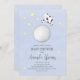 Esta design apresenta um guião capricho bonitinho e neutro do ponto de vista do gênero, com o URL da loja de códigos QR, com o site da página do evento no Facebook URL, com uma vaca a saltar sobre o tema da lua, um guião elegante de caligrafia, com o convite do chá de fraldas da tendência, e um céu azul e estrelas amarelas lua, o ritmo tradicional da viveiros, um modelo de cartão postal amigável, para a ser mãe da mamãe