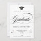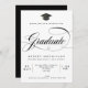 Um rico e um convite para a graduação elegante que inclui um boné de formatura preto com bruxelas de ouro falso e "formando" em letra de caligrafia de script preto, em fundo branco. O reverso está em preto sólido.