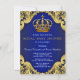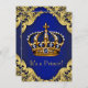 Chá de fraldas real azul e ouro príncipe convite com coroa azul e dourada sobre um elegante fundo azul real e espiral dourado. Este belo convite para chás de fraldas royal blue e gold prince é facilmente personalizado para o seu evento simplesmente adicionando os seus detalhes no estilo de letra e cor, redação e layout da sua escolha.
