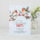 Robin birds, branch and berries Christmas holiday party Invitation. Invite your guests to a charming Christmas celebration with this delightful holiday party invitation. The design showcases a fir branch with berries and redbreast robins on it. The background is of pale blue color. The phrase "Christmas party" combines script and decorative fonts.