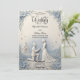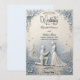 Set the tone for your formal engagement with a romantic, dusty blue and creamy off-white design featuring an elegant printed sculptural proposal scene.This formal stationery design employs a simulated bas-relief sculptural aesthetic, utilizing digital 3D shadow techniques to create the visual illusion of carved paper craft. The central composition features an elegant proposal scene with a kneeling groom and a bride in a flowing gown, set against a traditional chapel backdrop and framed by an intricate botanical border of leaves and floating petals. The atmospheric color palette pairs cool dusty blue and light grey tones against a warm, creamy off-white background, establishing visual hierarchy through sophisticated calligraphy script and traditional serif typography.This is a flat printed image with a faux embossed texture effect, not actual raised material.