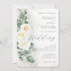 This romantic sage green wedding invitation features soft white roses, eucalyptus greenery, and delicate gold accents for an elegant and timeless celebration. Perfect for garden weddings, botanical themes, and soft neutral wedding palettes.