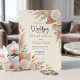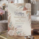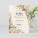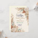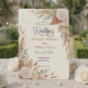 Invite your guests to an unforgettable celebration with earthy rust tones, dried palm fronds, and watercolor pampas grass for an elegant outdoor ceremony.Grounded in formal stationery design conventions, this elegant layout centers a modern calligraphy headline in warm brown and faux gold hues, supported by a highly legible, clean sans-serif secondary text. The composition is framed by an asymmetrical botanical border featuring blooming roses, dried palm fan leaves, and watercolor-style pampas grass plumes against a cream background. The color palette utilizes earthy rust, muted taupe, and soft sage green foliage, creating visual depth through simulated shadows and a subtle printed paper grain effect.This is a flat printed image with a printed paper grain and faux gold effect, not actual raised material.