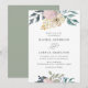 Convites florais elegantes e românticos com detalhes de seu casamento com buquês de flores de cor-de-água embaçadas, folhagem exuberante em tons de azul francês e verde próximo ao topo e ao fundo do convite. A parte de trás se inverte para uma cor verde sábio. Os convites de casamento floral são perfeitos para casamentos de jardim no primavera, verão ou outono.
