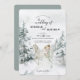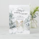 Este convite de casamento apresenta uma estrada de floresta branca no inverno coberta de neve, cercada de neve coberta por árvores verdes. No primeiro plano está uma noiva e um noivo com um cavalo branco. As cores utilizadas incluem o verde florestal com vários sábios e cinzas. No topo está um texto estilizado que apresenta os nomes da noiva e do noivo. Os detalhes do convite estão em cinzas profundas e são personalizáveis. A parte de trás do convite tem um fundo de sábio que se coordena com as cores da frente. Uma forma excelente de convidar convidados para o seu casamento.