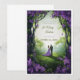 Entre em um conto de fadas com este convite de casamento incrivelmente lindo. Perfeito para um casamento inspirado em jardim ou natureza, este convite apresenta uma ilustração romântica de um casal caminhando de mãos dadas por uma floresta encantada. O rico arco floral roxo cria uma moldura deslumbrante, levando o olhar a um fundo suave e enevoado que se sente ao mesmo tempo místico e convidativo.