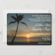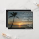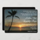 Este cartão caracteriza uma foto de um por do sol romântico da praia com uma silhueta da palmeira. Personalize este convite com sua informação do casamento. A parte traseira tem a abundância da sala se você precisa de fornecer mais detalhes. Este cartão trabalha bem para um tema da praia, um casamento do destino ou uns casamentos do por do sol.