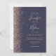 A margem esquerda deste elegante convite de casamento moderno apresenta um rosa dourado faux glitter design. O texto personalizável combina manuscrito colorido de rosa pálido, fontes copperplate e itálico em um fundo azul escuro. O verso apresenta um design brilhante rosa e preto correspondente.