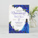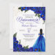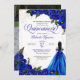 O convite da Quinceanera em rosas azuis reais com sotaques de ouro e uma garota com vestido elegante. Verifique o compro deste convite com meninas com diferentes cores de cabelo e tons de pele. Adicione sua foto à parte traseira desta design.
