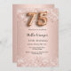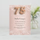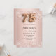 Um convite moderno, na moda e glamouroso para uma 75ª festa de aniversário. Um fundo rosa dourado com confetti .O nome é escrito com um script de estilo manuscrito. Personalize e adicione os detalhes da sua festa. O número 75 é escrito com uma fonte de estilo de balão, script.