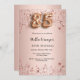 Um convite moderno, na moda e glamouroso para uma 85ª festa de aniversário. Um fundo rosa dourado com estrelas.O nome é escrito com um script de estilo manuscrito. Personalize e adicione os detalhes da sua festa. O número 85 é escrito com uma fonte de estilo balão, script.