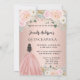 Um convite moderno, na moda e glamouroso para 2 Quinceañeras, festas de aniversário 15. Um fundo rosa de ouro decorado com flores cor-de-rosa pinceladas, flores e uma garota vestindo um vestido de bola. Os nomes são escritos com um moderno estilo escrito à mão. Personalize e adicione os detalhes da sua festa. Um nome em cada lado.