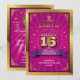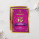 Um convite de festa de dezesseis anos doce que lembra um pôster de concerto ou circo. Uma medalha envolve as palavras douradas "Doce 16" no topo de um fundo rosa em explosão emoldurado em dourado. O nome da aniversariante se destaca em um banner roxo brilhante. Adicione informações da festa no verso junto com uma foto no lugar do grande tipo doce 16. Disponível com produtos correspondentes.