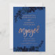 Tipografia rosa dourada Convite para festa de noivado de casamento azul floral com folhagem de cor verde-d-água pintada manualmente. O fundo de cor azul é totalmente personalizável