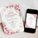 Convite de celebração de quinze anos em rosa dourado, rosa e branco. Características, fonte de letra manuscrita, borboletas, rosas em aquarela e tiara. Perfeito para uma celebração glamorosa de princesa elegante. Personalize com seus próprios detalhes. Convites impressos da Zazzle ou modelo digital para impressão instantânea