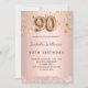 Um convite moderno, na moda e glamouroso para uma festa de aniversário 90. Um fundo metálico rosa dourado falso com estrelas douradas a pingar. O nome é escrito com um moderno e escuro, rosa dourado, escrito com letra de estilo manuscrito. Personalize e adicione os detalhes da sua festa. O número 90 é escrito com uma fonte de estilo de balão, script.