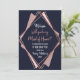 Elegante, chique e moderno com um toque retrô, contorno de diamante geométrico em rosa dourado falso impresso sobre azul-marinho, lilás e rosa claro com recorte em diamante, convite "Você será minha Dama de Honra?". Este design clássico e sofisticado é perfeito para a noiva moderna e elegante que deseja fazer com que sua Dama de Honra se sinta especial e amada. Personalize com sua própria mensagem na frente, bem como uma inicial monograma personalizada no verso. Todo o design é impresso com foto.