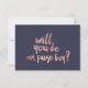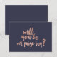 Uma moderna, original e chic tipografia de pincel com letras à mão em folha de rosa dourado falsa você será meu cartão paige boy em um fundo azul meia-noite elegante e simples personalizável