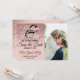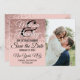 Glamoroso, sofisticado e elegante falso impresso brilhante rosa dourado em um fundo rosa, cartão de casamento Save-the-Date. Este design clássico e sofisticado é perfeito para o casal moderno e elegante que casa. Personalize com sua mensagem na frente e um monograma personalizado no verso. Todo design de impressão de foto.