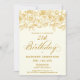 Rosas de ouro de linha aberta elegantes criam a borda superior perfeita. O fundo branco de marfim lhe dá um sofisticado brilho quente e a caligrafia acrescenta um toque luxo. Este convite faz parte da Coleção de Rosas Dourados de Luxe. Contém modelos para papelaria de suite de aniversário, sinais de boas-vindas e decorações de festas.