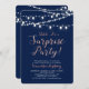 Celebre um dia especial com este convite de aniversário surpresa moderno! Este design apresenta a tipografia de na moda com texto rosa dourado e cordas leves. Perfeito para uma festa de jardim, uma festa de quintal ou uma festa temática de cor ouro e marinho.