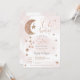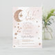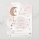 Querida! Uma pequena estrela está a caminho! Um elegante, adorável e fofo Rosa ouro brilhante estrelas da lua nuvens, oh convite de chá de fraldas com bonito lua reluzente com uma estrela pendurada, um aglomerado de estrelas com cor-de-rosa claro pastel e nuvens de água cinza com uma elegante tipografia de letra de pincel. Gravidez chá de fraldas neutra do ponto de vista do gênero, com a indicação de rosa, cinza, ouro e rosa,