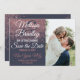 Glamorosa, chic e elegante faux imprimiram brilho de ouro brilhante rosa em azul marinho, cartão de casamento "Salvar a Data". Este design clássico e sofisticado é perfeito para o casal de competição de tendências e na moda. Personalize com sua própria mensagem na frente, assim como um monograma personalizado inicial no verso. Todas as impressão de fotos.