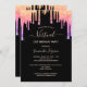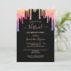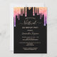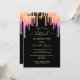 Um convite de aniversário virtual feminino e feminino 50º (ou qualquer idade). Na frente: Um fundo preto chic. Decorado com pingos de brilho coloridos do arco-íris, pingos de tinta parecem ouro roxo, rosa e falso e ouro rosa. Personalize e adicione um nome e detalhes da parte. O nome é escrito com um script de estilo manuscrito, letras rosa douradas leves. Traseira: fundo preto e brilho fraco.