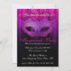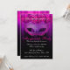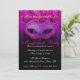 Convite Rosa e Roxo de Celebração de Festa de Mascarada. Um convite sofisticado e elegante com uma máscara de mascarada em tons de roxo e rosa com detalhes pretos, um fundo em tons de roxo/rosa com um padrão damasco sutil sobreposto em preto e tipo fancy personalizável para os detalhes da sua festa.