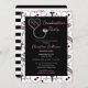 Enfermagem moderna ou outra profissão médica, design de convite à licenciatura em cor-de-rosa, cinzas, preto e branco, com formação de colagem médica à frente, com estetoscópio em forma de coração, ataduras, caduceus, ECG, agulhas de tiro, termômetros e comprimidos por Designs de Coração Feriados (todos os direitos reservados). A parte traseira apresenta um simples fundo listrado preto e branco (a cor preta pode ser alterada no modo "personalização").