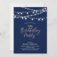 Celebre um dia especial com este convite de aniversário moderno chique! Este design apresenta as luzes de cordas e uma tipografia de script na moda rosa dourado com um fundo azul marinho. Você pode personalizar o texto para qualquer aniversário de idade/marco. Mais convites de aniversário para adultos e material de festa estão disponíveis no meu compro BaraBomDesign.
