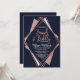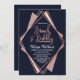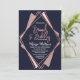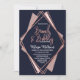 Elegante, chic e moderno com uma vibração retrorreflectora, esboços impressos em forma de diamante geométrico rosa de ouro em azul marinho, mauve e recorte de diamante rosa esfarelado, convites para Bubble e Brunch. Este design clássico e sofisticado é perfeito para qualquer evento de na moda e tendências, incluindo casamentos e ocasiões cotidianas. Personalize com sua própria mensagem na frente, assim como um monograma personalizado inicial no verso. Todas as impressão de fotos.