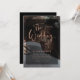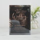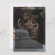 Estes convites de casamento modernos e elegantes apresentam a sua própria fotografia pessoal cobrindo completamente o fundo. Uma camada preta contém tipografia falsa do script de tendência rosa gold e a parte traseira da placa é preta. Um sorvete, na moda, olhe seus hóspedes amará!