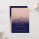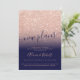 Anuncie o adiamento de seu casamento, aniversário, chá ou qualquer evento e novos planos com este moderno, original e simples brilho de ouro rosa num fundo azul de marinho totalmente personalizável. Perfeito para um casamento de tema elegante, com uma caligrafia elegante.