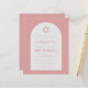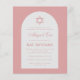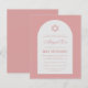 Um convite de bat mitzvah econômico. Em um fundo rosa poeira (rosa escuro), tem um arco branco com texto rosa poeira dentro. O nome é escrito em uma fonte caligráfica elegante. Acima do texto há uma estrela de Davi rosa poeira.