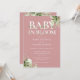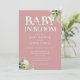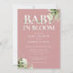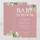 Convite de baby shower bebê em flor com tipografia elegante e belas folhagens botânicas verdes em um fundo rosa poeira rosa. Criado por Thisisnotme©