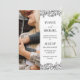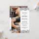 Dois lados em um convite de casamento fotográfico em branco com fontes pretas elegantes e traços semelhantes a rendas de arranjos florescentes feitos à mão com rosas e hálito de bebê. Adicione uma foto na frente do convite para o casamento floral, e outra foto na parte de trás onde você também pode adicionar detalhes.