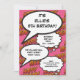 Um livro de banda desenhada, legal e moderno, rosa, inspirou um convite de aniversário que coloca o wham, zap, pow no evento de celebração de qualquer super-herói. O reverso apresenta uma bolha de fala e uma mensagem correspondentes em um padrão de bolinhas rosa de quadrinhos que você pode substituir por sua própria imagem ou foto. Projetado por Thisnotme©