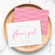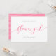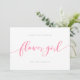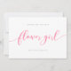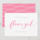 Cartão "Stylish Will You Be My Flower Girl" com a palavra "flower" escrita em uma fonte cursiva relaxada em rosa contra um fundo branco. O cartão tem um verso rosa com linhas brancas sobrepostas.