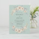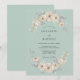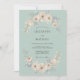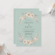 Este design apresenta um cenário sereno em verde espuma do mar adornado com ilustrações delicadas em aquarela. Rosas creme suaves e flores de pêssego estão aninhadas entre eucalipto azul empoeirado e folhagem prateada. A paleta de cores etérea cria um clima pacífico e romântico perfeito para um evento de primavera ou verão. Elementos botânicos elegantes envolvem o centro para criar uma estética graciosa e sofisticada.