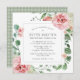 Um convite muito bonito para uma festa de aniversário 90. A forma quadrada moderna apresenta um quadro botânico decorado com rosas cor-de-rosa e híbridos brancos. Lindas folhas verdes de eucalipto e ramos de rosa criam uma vibração aberta e arejada. Todo o texto é editável.O plano de fundo do convite é o padrão de verificação verde e branco do país rústico. Estão disponíveis artigos de papelaria coordenadores e de papelaria.