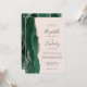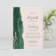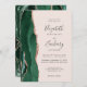 A borda esquerda deste elegante convite de casamento moderno apresenta uma esmeralda verde aquarela agate borda aparada com falsa rosa dourada. O texto personalizável combina a escrita manual de cinzas de carvão, fontes em copperplate e itálico em um fundo cor-de-rosa pincelado. O verso apresenta um design emerald verde e rosa dourado.