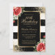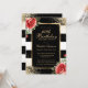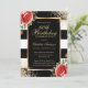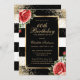 Convite floral elegante de 60 anos, preto e branco, listrado, com uma estrutura de ouro decorada por um confete de ouro, rosas vermelhas e verde.