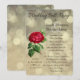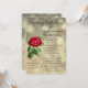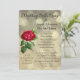 Um convite de casamento pós-casamento elegante e sofisticado. Especialmente adequado para casais que se casaram em uma viagem romântica e desejam celebrar com amigos e familiares em casa. O design é uma ilustração vintage de uma rosa vermelha aberta e florescendo com o caule visível e rodeada por folhagem verde. O fundo é um padrão mágico de bokeh dourado que dá um efeito de luzes desfocadas.