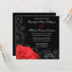Belo convite de casamento floral temido. Apresentando uma rosa vermelha clássica com elegantes espirais floridas sobre fundo preto. Flourados por © Mujka Design
