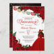 Convite de quinceanera em rosa vermelha de robi com sotaque de ouro e papel picado. Verifique o compro deste convite com meninas com diferentes cores de cabelo e tons de pele.