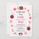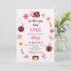 Floral Red Pink Nosso Pequeno primeiro aniversario Ladybug Convite à Senhora Docente para o primeiro convite de aniversário para uma menina com quatro joias bonitinhas, algumas flores, folhagem e linhas de trajetória de voo de linha preta. Este convite de primeiro aniversario de joanilha é totalmente editável e pode ser usado para qualquer idade.