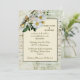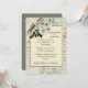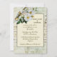Um convite de casamento lindo com um fundo de uma carta antiga verde. O centro bege é realçado com rosas brancas lindas e letras em dourado no convite.